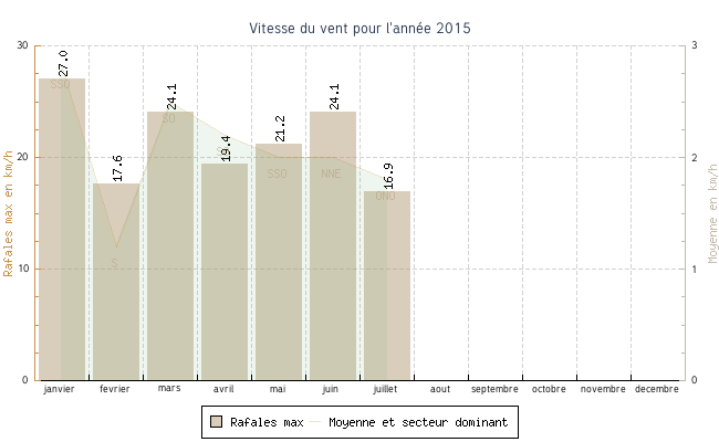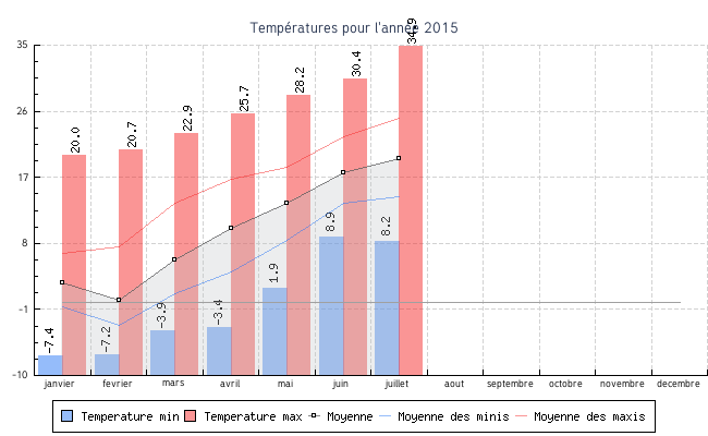 | juillet | 8.2 °C | 14.3 °C | 34.9 °C | 25.1 °C | 19.6 °C | 1.8 km/h | 16.9 km/h | ONO |